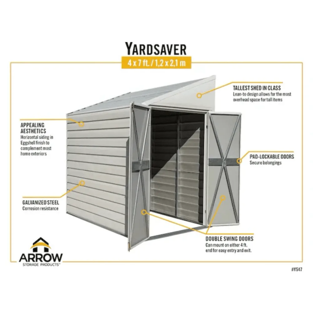 Arrow Yardsaver 4 x 7 ft. Galvanized Steel Lean-To Outdoor Storage Shed, Eggshell