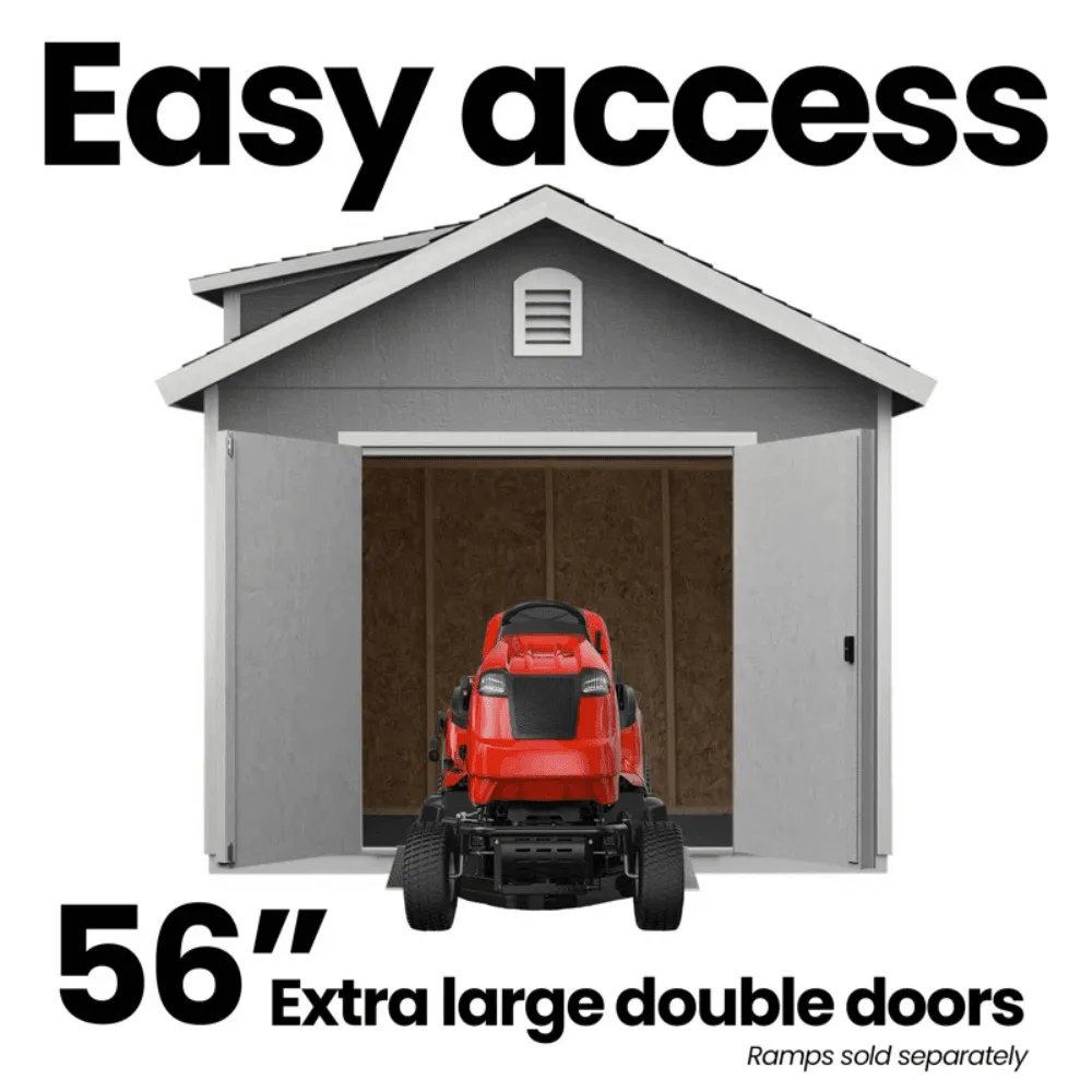 - depth 1,018 cubic feet of storage capacity Ideal for storage, hobbies, or workspace Durable Construction Built with 2×4 wood framing Treated engineered wood siding for resistance against fungal decay and wood-destroying insects Enhanced Accessibility Pre-hung double doors (56” W x 6’ H) Integrated transom windows for extra light Full-length galvanized steel hinges prevent sagging Natural Light & Ventilation Three operable windows and three transom windows for ample natural light Two arched gable vents allow for proper airflow Customizable Interior Seven-foot tall sidewalls and ten-foot roof peak for vertical storage Easily accommodates tall items like ladders and garden tools CONSIDERATIONS Foundation Not Included – Requires a prepared base before assembly.