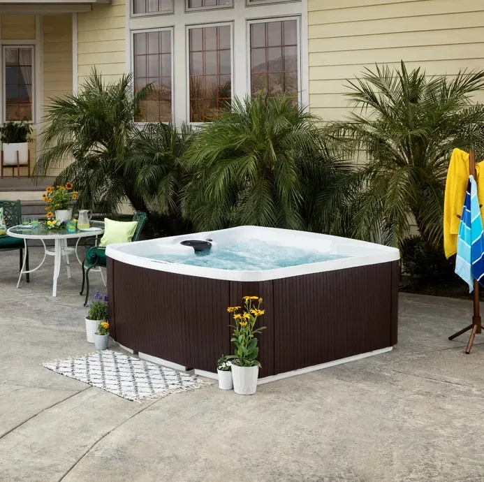 - With comfortable lounge seating and space for up to 6 adults, this premium spa features a relaxing waterfall, multi-color underwater LED lighting, and a durable faux-wood exterior for a stylish, modern look.