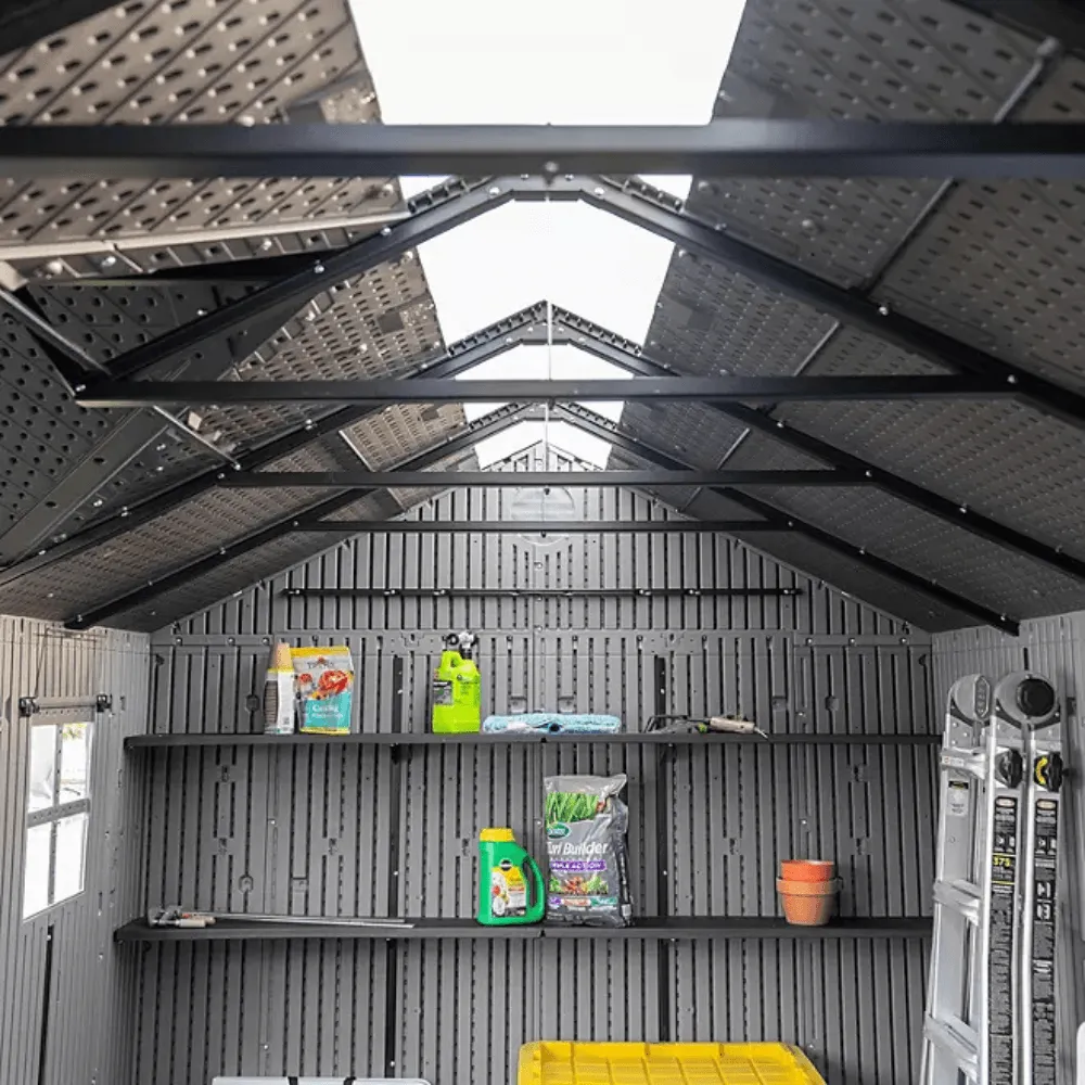 - With a high-pitched roof for efficient drainage and a Double Wall System constructed from high-density polyethylene (HDPE) panels reinforced with steel, this shed provides strength, stability, and resistance to harsh weather conditions.
