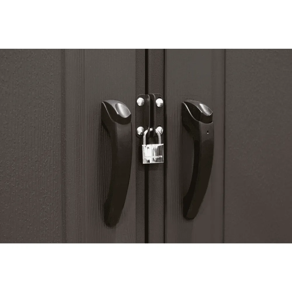 - With weather-resistant construction, reinforced doors, and a spacious interior, this shed provides secure, maintenance-free storage for your gardening tools, lawn equipment, bikes, patio furniture, and more.